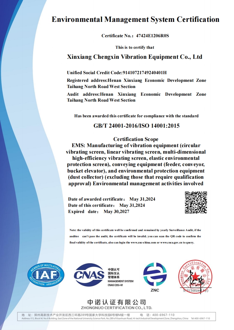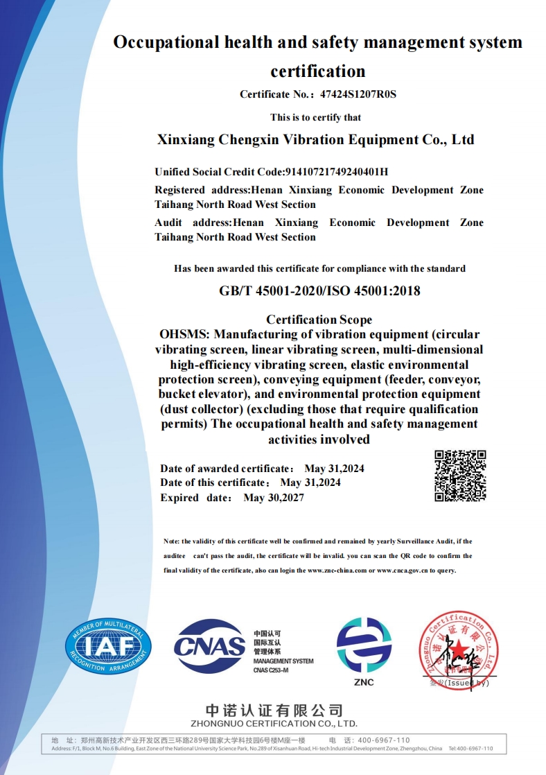 Xinxiang City Chengxin Vibration Equipment Co., Ltd. is a professional manufacturer of vibration equipment and mining machinery equipment. The company was established in 2003 with a registered capital of 58 million yuan and more than 500 employees,including more than 80 technicians.It is a comprehensive enterprise integrating R&D, production and sales. The company is located in the Xinxiang Economic Development Zone, Henan, China, covering an area of 80,000 square meters with a building area of 68,000 square meters. The company is a high-tech enterprise in Henan Province, and has taken the lead in passing ISO quality system certification, environmental system certification, and EU compulsory CE certification.