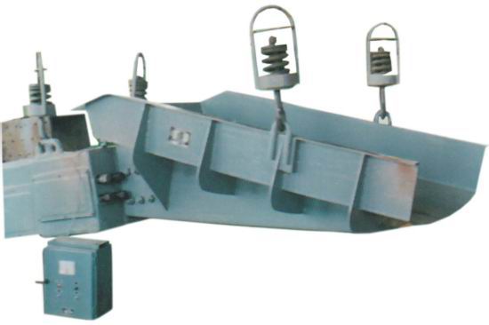 The electromagnetic vibration feeder is a relatively complete elastic system with dual particle directional forced vibration. The entire system operates in a low critical resonance state, and by using an electromagnetic exciter to drive the trough to perform reciprocating vibration at a certain inclination angle, the material moves along the trough. Material 2 is placed on the feeding tank 1 supported by the main vibration spring 3, and the armature 4 is integrated with the main vibration spring of the tank. The coil 6 is wound around the iron core 5. The unidirectional pulsating current after half wave rectification flows through the coil, thus generating corresponding pulsed electromagnetic force in the electromagnet. In the positive half cycle of alternating current, pulsating current flows through the coil, generating pulsating electromagnetic attraction between the iron core and the armature, causing the groove to move backward, and the main spring of the exciter to deform, storing potential energy; In the negative half cycle, no current passes through the coil, and the electromagnetic force disappears. The armature separates from the electromagnet under the action of the spring force, causing the material groove to move forward. In this way, the material groove continuously oscillates back and forth at the frequency of the AC power supply.